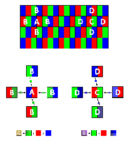 Dunque, a quanto pare, non si può generare un'immagine a colori da un singolo sensore CCD microfiltrato, senza ricorrere all'interpolazione software. E' possibile, però minimizzare il problema ricorrendo ad uno schema di funzionamento più sofisticato, come quello mostrato in figura. Si basa sull'utilizzo di pixel rettangolari (invece che quadrati) di dimensione esattamente pari alla metà di punti immagine che intendiamo acquisire. Secondo lo schema in figura per ogni pixel della nostra immagine conosciamo il valore di due delle tre componenti cromatiche primarie mentre ben quattro pixel nel suo intorno possono fornire informazioni circa la terza. Ad esempio del pixel A conosciamo esattamente la quantità di rosso e di blu di cui è composto il pixel acquisito mentre dai pixel identificati con la lettera B "abbiamo di che interpolare" circa la componente verde. Lo stesso accade per il pixel C (così come per gli altri punti da acquisire) di cui è nota la quantità di rosso e di verde mentre il blu possiamo interpolarlo dai quattro pixel identificati dalla lettera D.