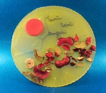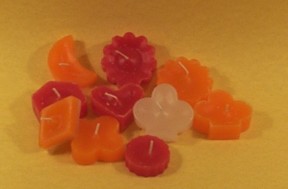 foto | 40002.01 | Candele galleggianti di vari colori, profumi e forme (stella - mezza luna - fiori - cuore - rombo - esagono) | circa h= 4.5 cm l= 3 cm prof= 2 cm | confezione da sei combinate in maniera casuale | 7.75 | Lit.15.000 |