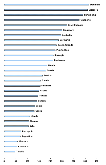 | Nota: in questa analisi, come in quelle che seguono, non sono considerati i paesi dell'ex Unione Sovietica e dell'Europa orientale. Queste informazioni mancano nei sistemi di dati utilizzati, probabilmente perché in seguito ai grandi cambiamenti avvenuti in molti di quei paesi non è possibile, almeno finora, costruire serie storiche coerenti. |
