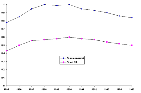 L'incidenza della pubblicità in Italia rispetto al PIL e ai consumi, che era stazionaria o in diminuzione negli anni '70, è cresciuta fra il 1980 e il 1988, ma dal 1990 è in diminuzione. Da notare che i consumi famigliari sono diminuiti, in termini reali, nel 1993; sono in leggera ripresa dal 1994, ma crescono meno del PIL.
