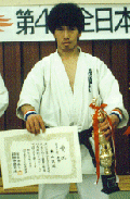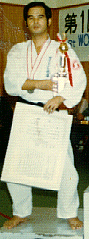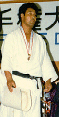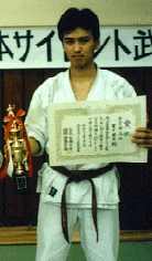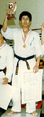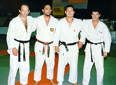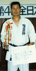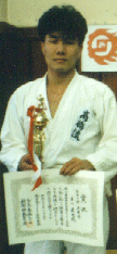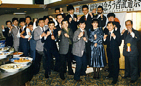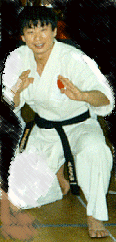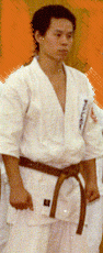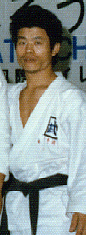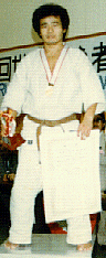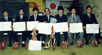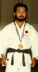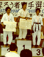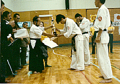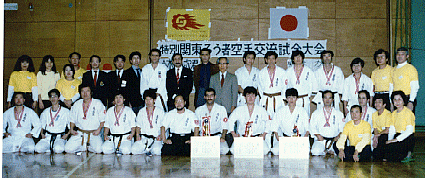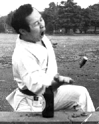 center ) the great master and founder for the all deaf Budo group Tadayo Takahashi was young past to show his power breaking for bottle; right ) during the 10th anniversary party for all deaf martial artists at Tokyo on february 14th, 1988.