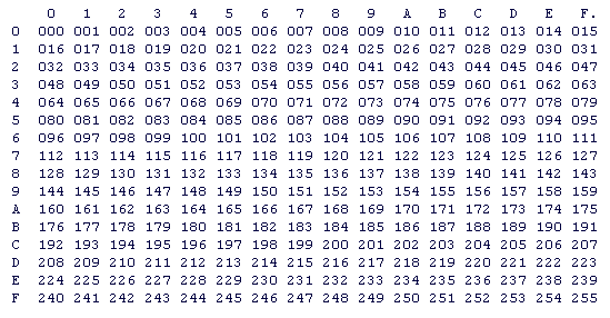 Nota: i caratteri Microsoft Dos® sono richiamabili direttamente da tastiera digitando Alt + il numero decimale corrispondente al carattere, secondo la tabella di cui sopra. I numeri devono essere digitati dal tastierino numerico. Vedere più avanti per una tabella di conversione esadecimale-decimale.