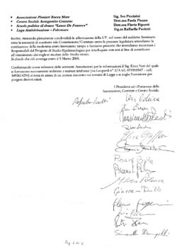 ASSOCIAZIONE “COMITATO DEI CITTADINI RESIDENTI A VILLANOVA” EVIDENZIATI RILEVANTI ANOMALIE E DUBBI SULLA INTERA PRATICA RELATIVA ALL’ATTO DI VENDITA ALLA RAFFINERIA API DI UNA PORZIONE DELLA FOCE DEL FIUME ESINO! Si informano i cittadini di Falconara e l’Opinione pubblica che, a complemento dell’Esposto presentato a Novembre 2002 dai Comitati alla Procura della Repubblica di Ancona contro la vendita a favore della raffineria API della porzione della “FOCE del fiume Esino” - che corrisponde alla particella catastale n° 319 -, le scriventi Associazioni hanno prodotto – alla fine dello scorso Gennaio - ulteriore documentazione contenente altre motivazioni di dettaglio emergenti soprattutto dalla Relazione redatta a riguardo dai propri Consulenti Tecnici. In particolare sono stati portati all’attenzione della Procura della Repubblica altri elementi che, a nostro avviso, evidenziano rilevanti anomalie e dubbi sulla intera pratica relativa a quell’Atto di vendita. Specificatamente tali dubbi e perplessità derivano proprio da vizi, che noi riteniamo possibili, concernenti il trasferimento della suddetta porzione di “FOCE fluviale” dal Demanio Marittimo (tale per Legge) a proprietà della Società API S.p.A. . Infatti dalle foto riproducenti la foce del fiume Esino e dalle opere realizzate dalla Società API in diversi momenti storici, risulta come la foce del fiume sia stata modificata sensibilmente dalle stesse opere attuate dalla Società API per l’ampliamento della raffineria. E’ indiscutibile come l’interramento attuato dalla Società API negli anni ’60 sia avanzato dentro la foce del fiume Esino, oltre le linee che fissano la sua larghezza normale, ed abbia comportato alterazioni morfologiche della foce con ripercussione nella sua dinamica idraulica. Tanto che nel Piano Straordinario di Assetto Idrogeologico emanato dalla Regione Marche con Delibera della Giunta Regionale, n° 2701/2000, ai sensi della Legge 267/1998 (Legge Sarno), viene evidenziata la sottrazione all’alveo fluviale di ben sette campate del ponte ferroviario sul fiume Esino da parte del terrapieno realizzato dalla Società API! (vedi foto) Da quanto sopra esposto la particella di terreno ex 319, generata catastalmente a seguito del suddetto interramento attuato dalla Società API, apparteneva comunque al Demanio Marittimo perché generata nella foce del fiume Esino. Corre l’obbligo di evidenziare che ancora una volta i cittadini di Falconara debbono, da soli prendere le iniziative necessarie per garantire la massima attenzione e cura a tutela del territorio ed a salvaguardia dei diritti della comunità. Le scriventi Associazioni stanno operando con enormi sacrifici economici e personali affinché una parte del fiume Esino, e precisamente la sua foce, non finisca in mano di privati e non venga sottratta al patrimonio pubblico appartenente all’intera Comunità. Si rammenta che già a Maggio del 2002 con la mobilitazione della cittadinanza a mezzo della “biciclettata” e con un simbolico “assalto” della scogliera lato API, civilmente si contribuì ad impedire la realizzazione da parte dell’API della palancolata (barriera di acciaio) nell’alveo del fiume Esino.