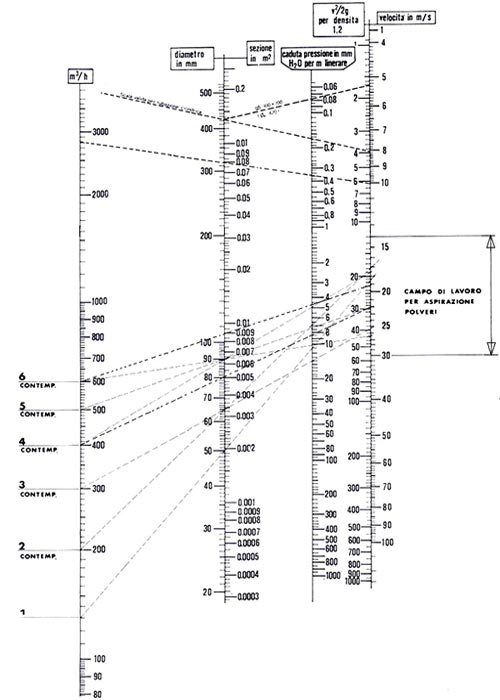 Per il calcolo delle perdite di carico nelle tubazioni per impianti di aspirapolvere centralizzati, può essere d'aiuto l'utilizzo del seguente diagramma tenendo presente che:- la velocità dell'aria ottimale per un efficace trasporto della polvere e con perdite di carico normali, è di 17/20 m/sec