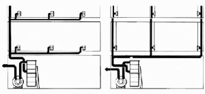- distribuzione orizzontale con collettore verticale, che permette di sfruttare gli spazi di piani interrati, volumi tecnici o controsoffitti.